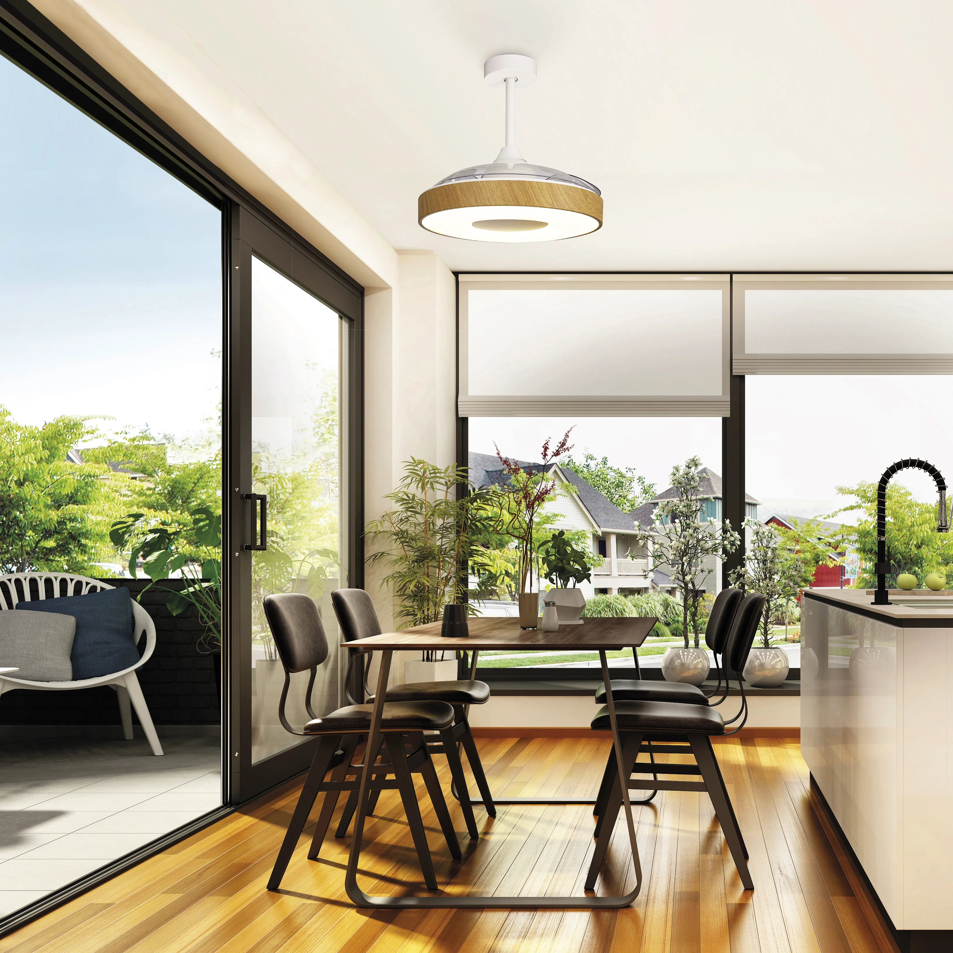 С помощью пульта пользователь может управлять яркостью и цветовой температурой освещения, скоростью вращения вентилятора, а также открывать или закрывать лопасти.